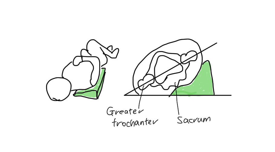 ●Beyond tilting the body, inserting the cushion under the contralateral pelvic area might create a support surface that counters shear over the greater trochanter in the 30° lateral position.