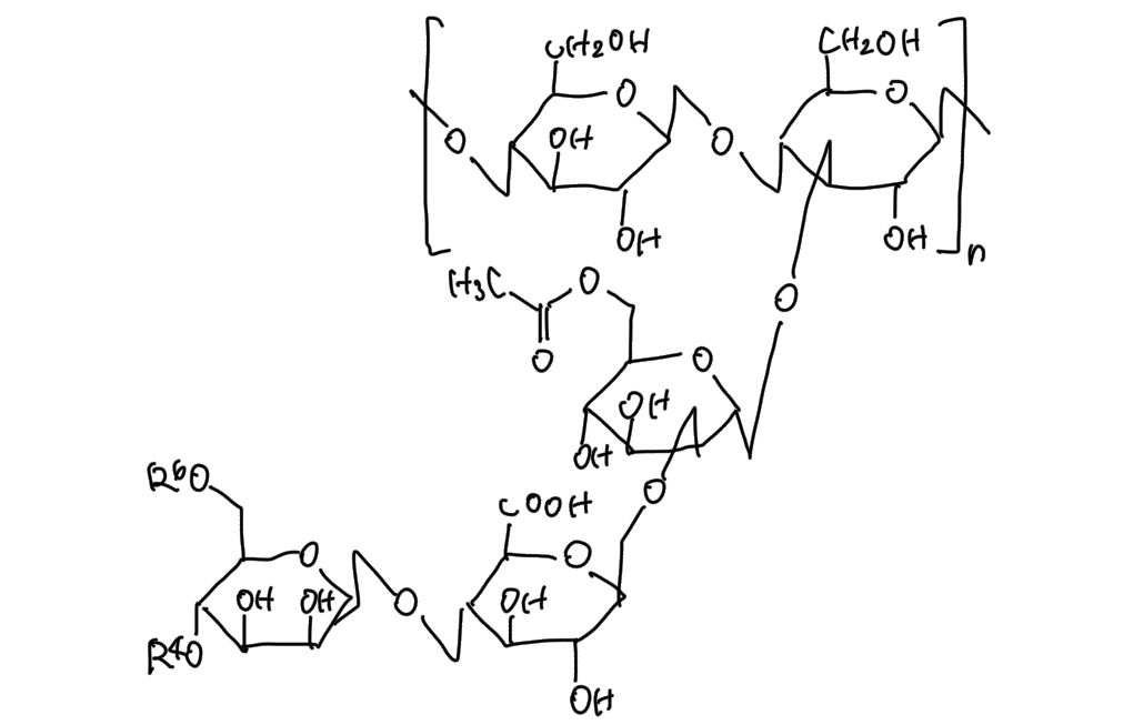 Its structure consists of a glucose backbone with mannose and glucuronic acid side chains. Numerous hydrophilic functional groups interact with water to form a mesh-like gel network.