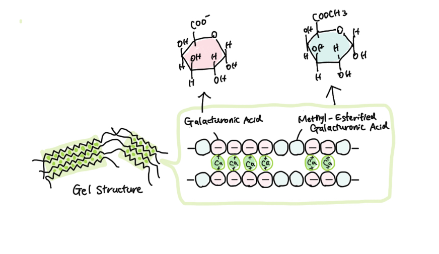 - Ca²⁺ binds to the –COO⁻ groups of pectin or alginic acid.