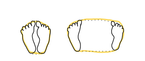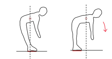 To shift the center of gravity over the feet, the torso must incline forward, pushing the projection to the front edge of the base of support.