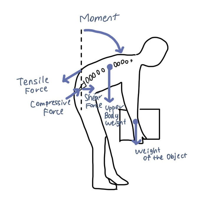 When the caregiver leans forward, both their upper body and the user’s weight act as a lumbar flexion moment.