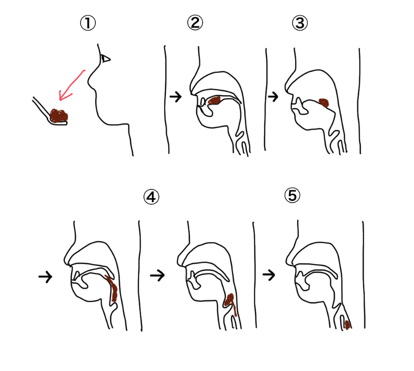 認知した食物を口腔内に入れ、咀嚼し唾液と混ぜて飲み込むのに適した形態にします。舌の上でまとめられた食べ物を食塊といいます。