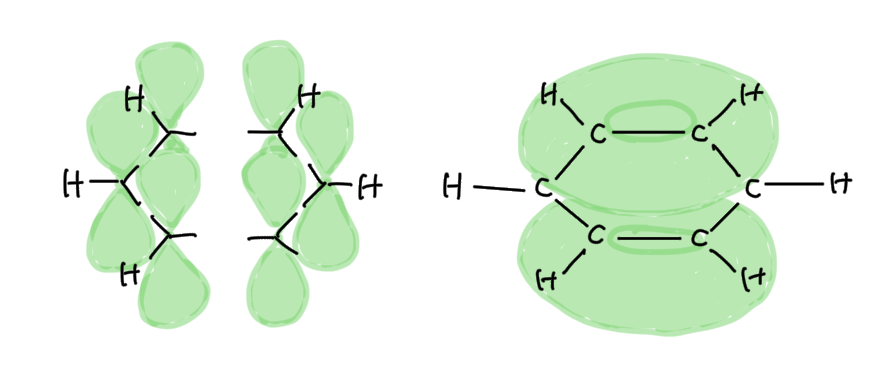 画像:ベンゼン環における共鳴構造と非局在化した電子雲。π電子が環全体に広がり、電子は分散され安定している)